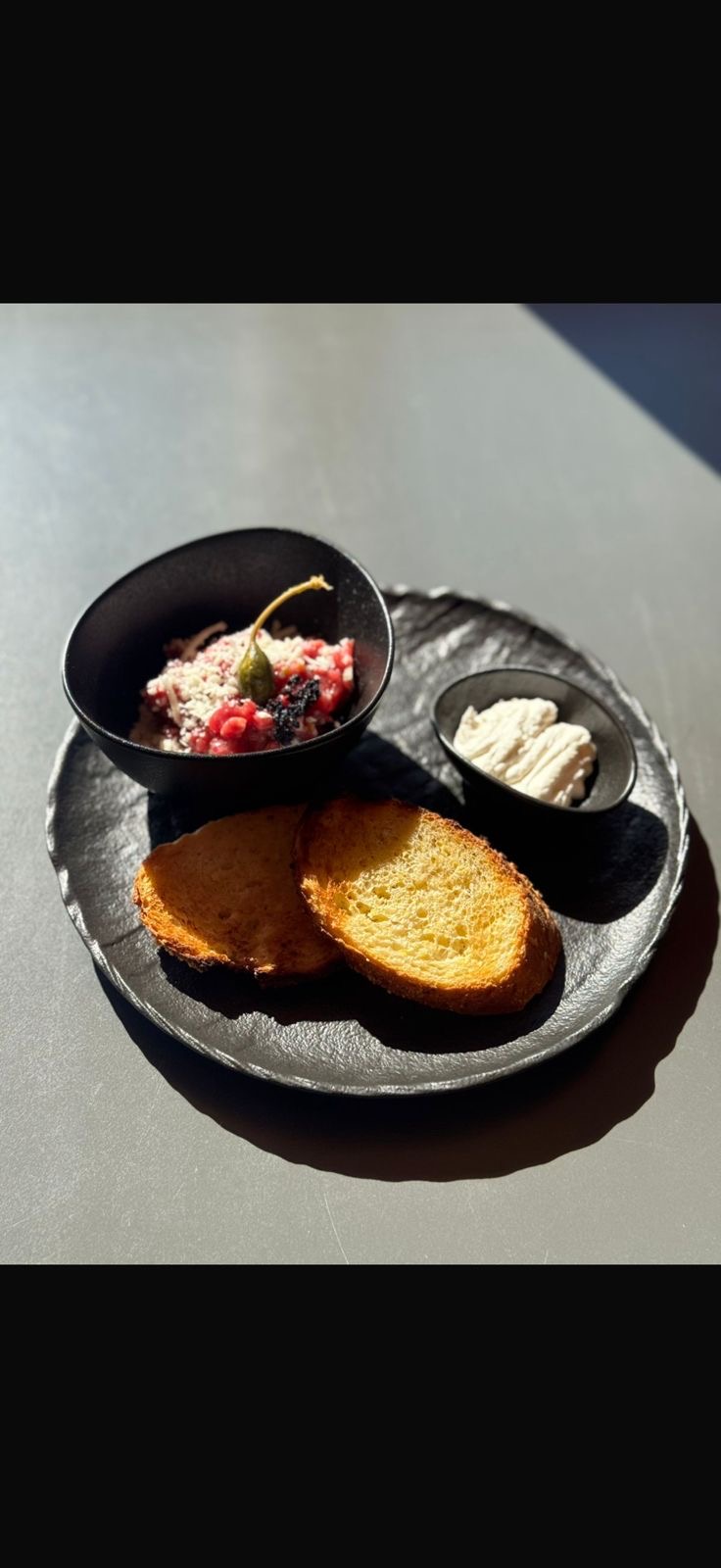 Вырезка говяжья, лук ялтинский, каперсы, сыр пармезан, хлеб кукурузный, соус тар-тар, икра тобико