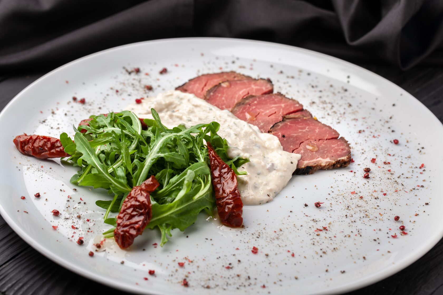 Ростбиф с рукколой, вялеными томатами под соусом тоннато